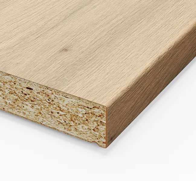 Worktop made of chipboard in accordance with EN 312. Decorative side covered with high-quality HPL, underside protected with antistretch paper. The front edge of the worktop has a 3 mm radius of curvature. The rear edge is protected with a protective edge band. A variant profiled on both sides is also available.