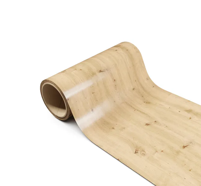 Paper-based veneer with a weight of 50-110g/m2, impregnated with a mixture of urea-formaldehyde and melamine-formaldehyde resins with additives, with or without a lacquer coating, in the form of a web rolled-in coil.