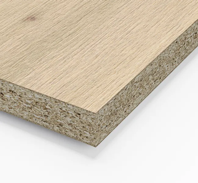 Urea resin bonded particleboard with decorative melamine facing on both faces, awarded with the Blue Angel for the thickness range 8-25mm.