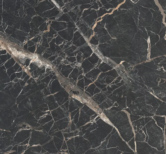 Caribbean marble this time in a dark colour version. The dark, almost black background emphasises the rich, dynamic vein pattern of the marble even more strongly. It goes well with light, elegant wood with a regular grain and with dark uni decors.