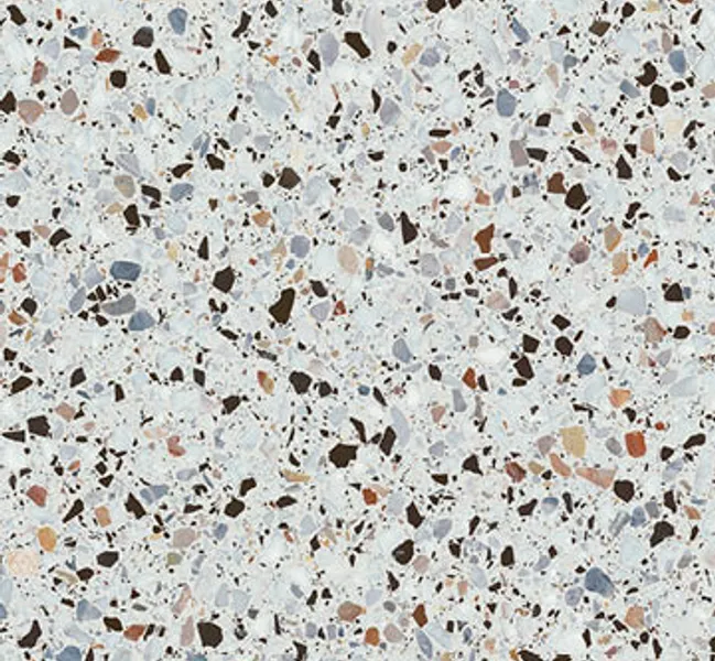 Terazzo Colore w nowoczesnym wydaniu. Bardzo wyrazisty i dynamiczny za sprawą różnych odcieni kamyków wtopionych w jego strukturę. Od jasnych odcieni pomarańczy, poprzez ceglany róż oraz beże, po ciemne brązy i grafit. Terazzo Colore zachwyca ferią odcieni skontrastowanych na tle ciepłej bieli. Doskonale sprawdzi się jako akcent na frontach mebli, ale zestawiony ze stonowanymi unikolorami, może stanowić dla nich doskonałe tło w bardziej odważanych aranżacjach.